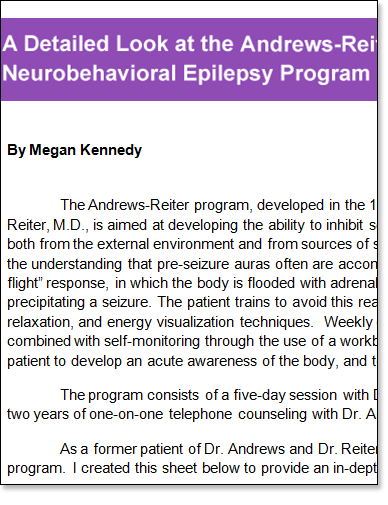 "A Detailed Look at the Andrews-Reiter Neurobeheavioral Epilepsy Program," a step-by-step description of how the A-R program operates, written by Megan Kennedy, an author and former patient