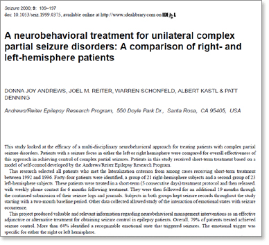 "A Neurobehavioral Approach for Treatment of Complex Partial Epilepsy: Efficacy," a medical study analyzing the effectiveness of the A-R approach, written by Dr. Donna Andrews and Dr. Joel Reiter, published in the respected medical journal Seizure